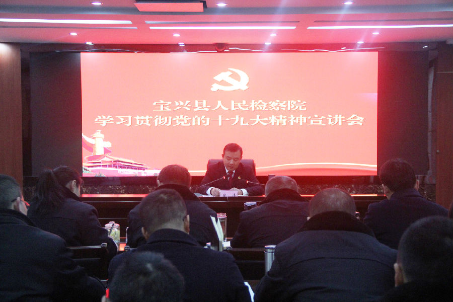 12月14日上午,宝兴检察院组织召开专题学习贯彻十九大精神宣讲会,院党组书记、检察长陶涛为全院干警做作了党的十九大精神宣讲报告,重点解读了十九大报告的精神实质和核心要义,进一步筑牢全院干警学习贯彻党的十九大精神思想基础。