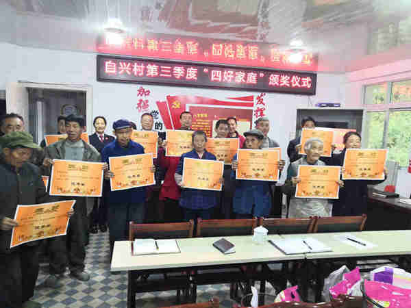 活动共分为四个阶段,一是向全体驻村工作队成员、村组干部传达了市委四届四次会议精神、县委十四届六次全会精神,要求以习近平新时代中国特色社会主义思想为指导,深入贯彻落实习近平总书记对四川工作、雅安发展系列重要指示精神。二是召开脱贫攻坚工作推进会。听取第一书记汇报自兴村近期脱贫攻坚工作情况及后期工作安排部署。三是举行爱心捐赠交接仪式。该院领导一行代表院全体检察干警向自兴村捐赠爱心扶贫资金8000元,旨在通过此次爱心捐赠活动,向贫困群众奉献爱心,培养检察干警的社会责任感,增强扶贫济困意识。四是举行自兴村“四好家庭”颁奖仪式。参加活动的院领导向自兴村“四好家庭”颁发了奖状和奖品,号召全村人民从小事做起,搞好环境卫生,养成好习惯,形成好家风,建立自兴村农民群众全力脱贫奔康的致富的信心。