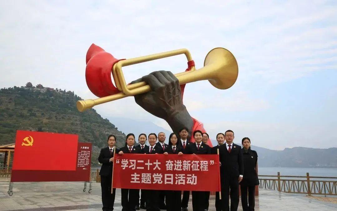 在汉源湖畔,大家站在冲锋号前,面对鲜红的党旗,党总支书记张小川带领大家昂首而立,郑重地举起右手,重温入党誓词,在庄严的红色洗礼中,铭记赤诚初心使命。