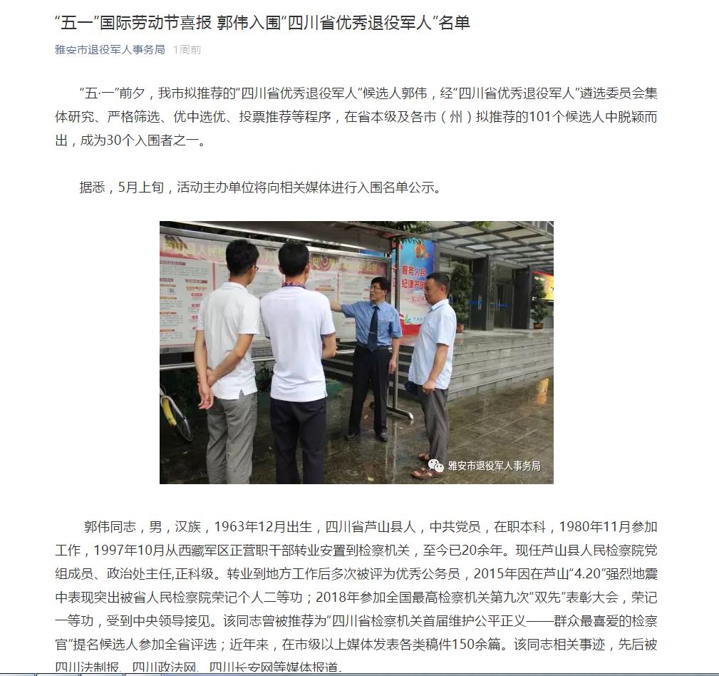 现任芦山县人民检察院党组成员、政治处主任,正科级。转业到地方工作后多次被评为优秀公务员,2015年因在芦山“4.20”强烈地震中表现突出被省人民检察院荣记个人二等功。 2018年参加全国最高检察机关第九次“双先”表彰大会,荣记一等功,受到中央领导接见。 郭伟同志曾被推荐为“四川省检察机关首届维护公平正义——群众最喜爱的检察官”提名候选人参加全省评选。