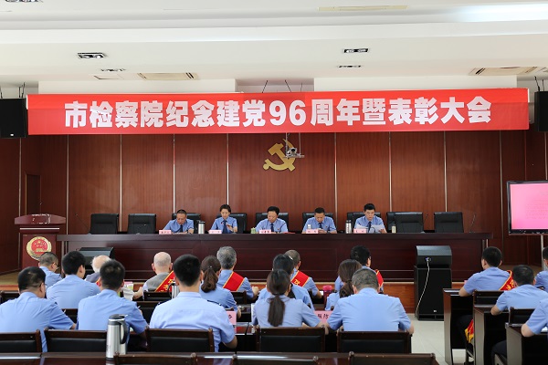 6月29日,市院召开纪念表彰大会,庆祝中国共产党成立96周年,隆重表彰2016年度涌现出的先进基层党组织、优秀共产党员和优秀党务工作者,党组书记、代理检察长刘孝勇宣讲省十一次党代会精神并作了重要讲话。会议由市院党组成员、机关党委书记庄萍主持,市院全体党员、干警和离退休支部党员代表参加了会议。