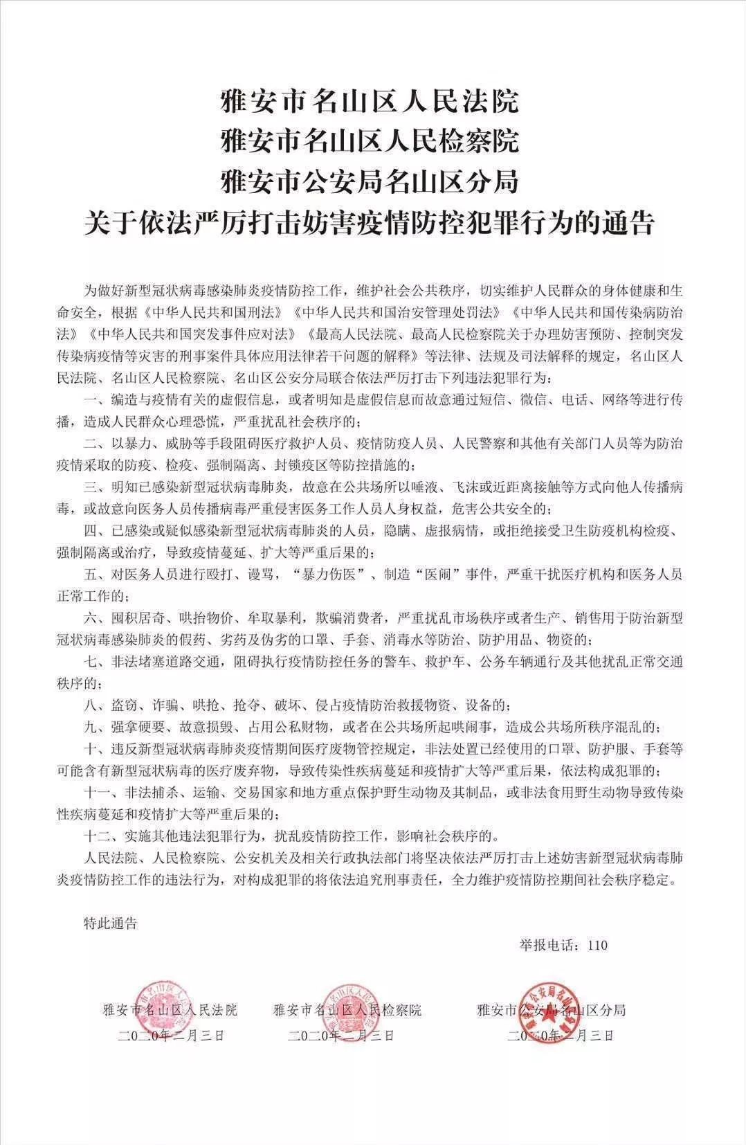 为做好新型冠状病毒感染肺炎疫情防控工作,维护社会公共秩序,切实维护人民群众的身体健康和生命安全,根据《中华人民共和国刑法》《中华人民共和国治安管理处罚法》《中华人民共和国传染病防治法》《中华人民共和国突发事件应对法》《最高人民法院、最高人民检察院关于办理妨害预防、控制突发传染病疫情等灾害的刑事案件具体应用法律若干问题的解释》等法律、法规及司法解释的规定,名山区人民法院、名山区人民检察院、名山区公安分局联合依法严厉打击下列违法犯罪行为: