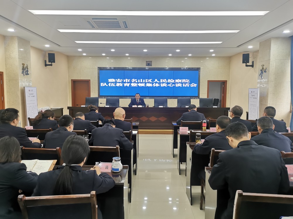 按照政法队伍教育整顿安排部署,为认真做好思想发动和政策宣讲,弘扬刀刃向内的自我革命精神,确保下一阶段查纠整改环节取得成效,4月8日下午,名山区检察院召开集体谈心谈话会。党组书记、检察长李宣勇主持会议并重点对队伍教育整顿期间“自查从宽、被查从严”的政策进行了再次宣讲和解读。院班子成员和在编在职干警参加会议。