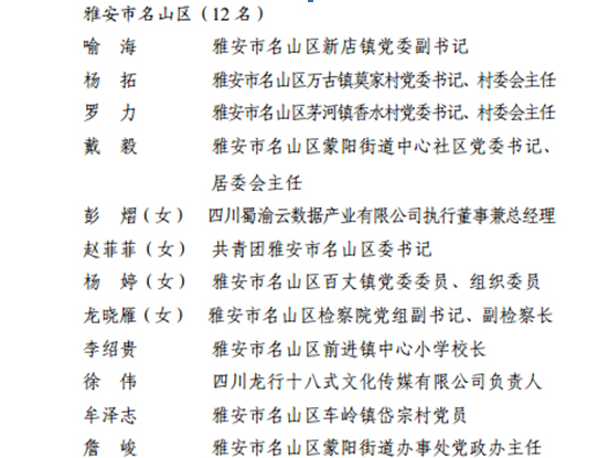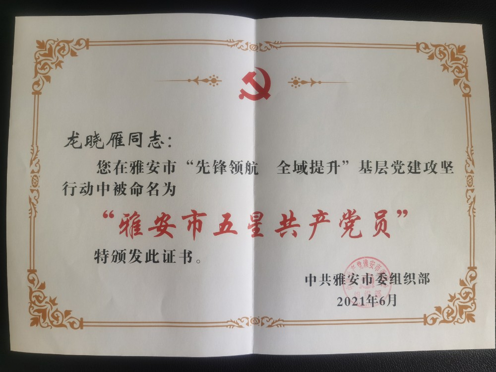 为隆重庆祝中国共产党成立 100 周年,深化“先锋领航·全域提升”基层党建攻坚行动,进一步营造竞进有为、争创一流的浓厚氛围,日前,中共雅安市委组织部发布《关于评选命名雅安市“五星党支部”“五星党员”和“五星党支部书记”的通知》,名山区检察院龙晓雁获评“五星党员”。