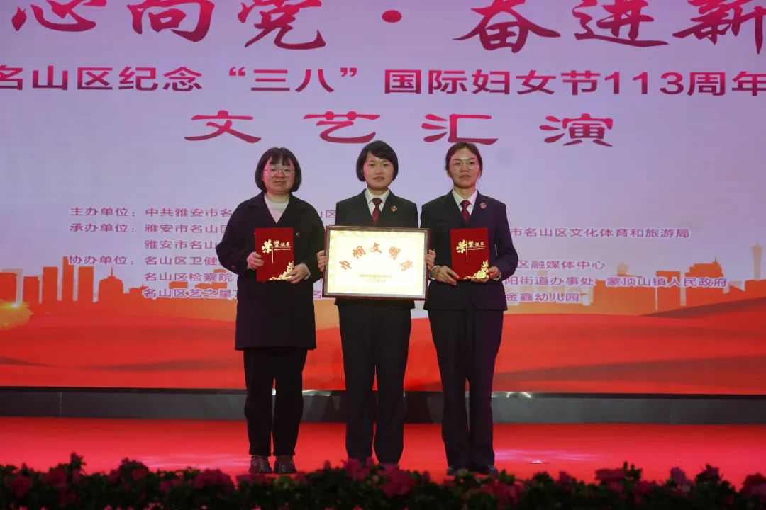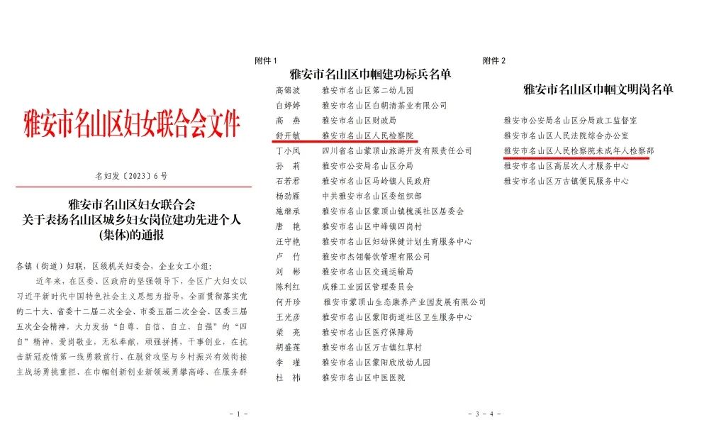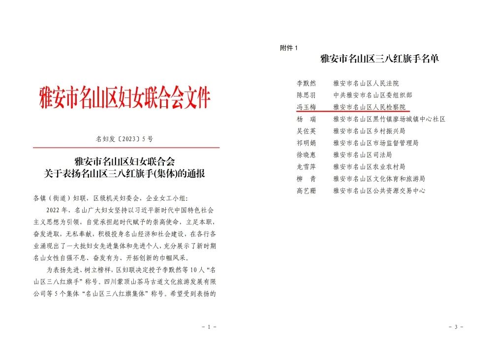 近日,雅安市名山区妇女联合会印发《关于表扬名山区城乡妇女岗位建功先进个人 (集体)的通报》《关于表扬名山区三八红旗手(集体)的通报》,名山区检察院未成年人检察部获评“雅安市名山区巾帼文明岗”、舒开敏获评“雅安市名山区巾帼建功标兵”、冯玉梅获评“雅安市名山区三八红旗手”。