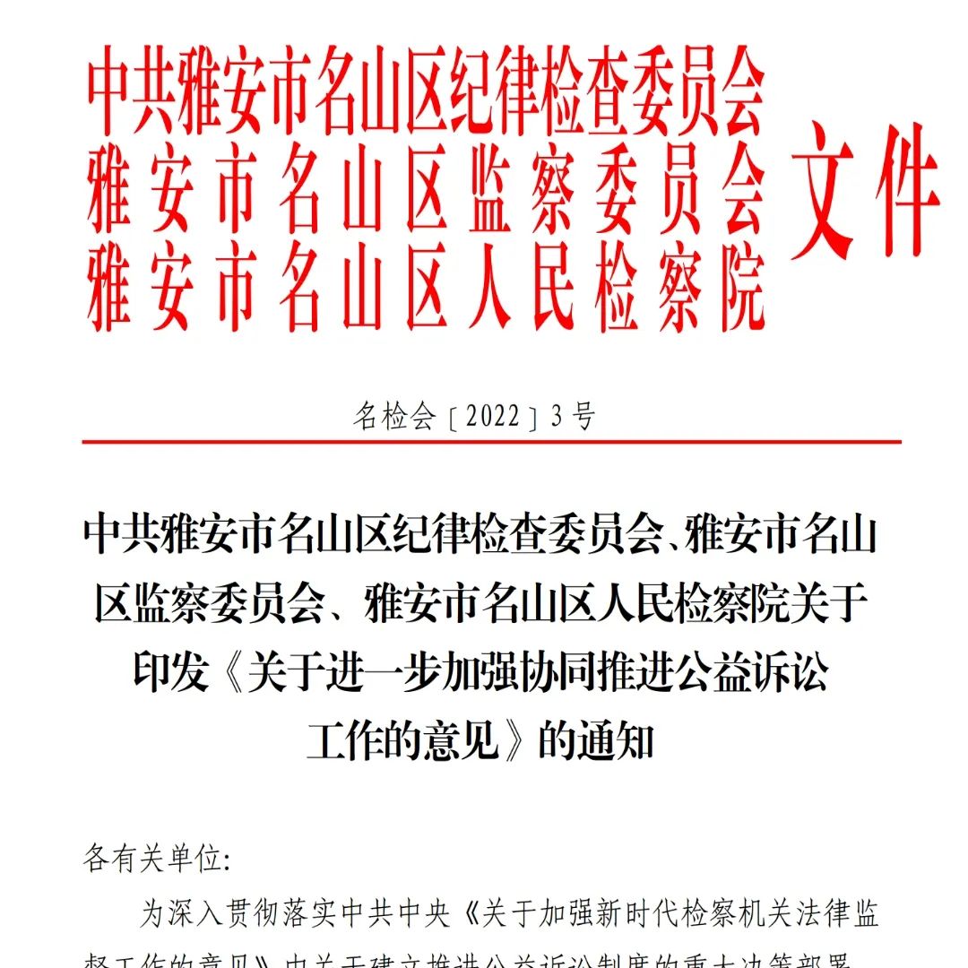 创新机制建设,积极同有关部门加强协作,与名山区纪委监委、名山区河长制办公室等相关部门先后会签《协同推进全区水土流失治理服务保障长江经济带绿色发展的意见》《关于协同推行河长+检察长协作机制的意见》《关于进一步加强协同推进公益诉讼工作的意见》,加强同行政机关衔接配合,创新“公益诉讼+”模式,实现了公益诉讼线索的多角度、广范围的有效收集,使公益诉讼检察在生态环境保护方面的工作更显成效。