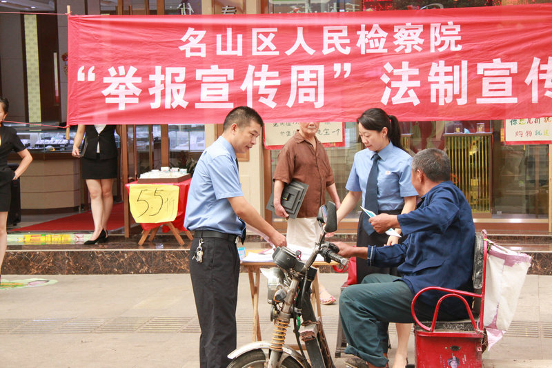 6月23日至26日,名山区人民检察院开展了以“落实举报规定,推进反腐倡廉和规范司法”为主题的“举报宣传周”活动。宣传活动通过检察长接访、举报宣传进企业、社区,邀请区人大代表、人民监督员参加“检察开放日”活动等多种形式进行。
