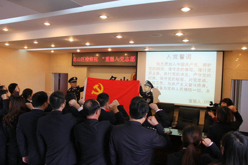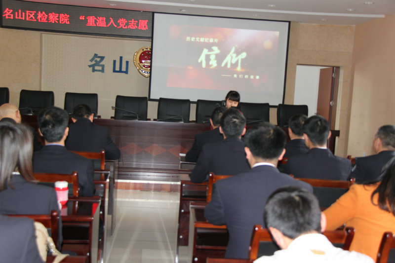 4月29日,名山区检察院党总支部开展“重温入党志愿、重温入党誓词”主题党日活动。会议由机关党总支部书记龙晓雁主持,全体党员、入党积极分子参加了活动。 观看专题片《信仰》举行宣誓仪式第一支部开展专题学习和讨论 第二支部开展专题学习和讨论