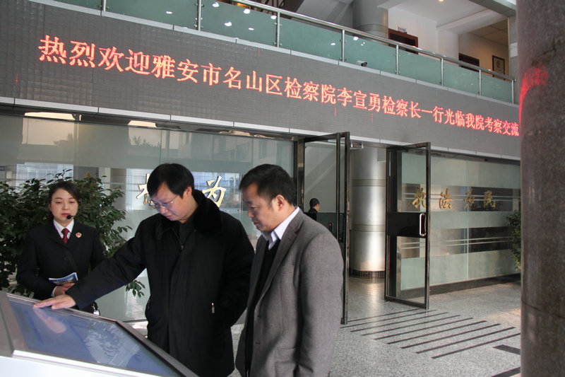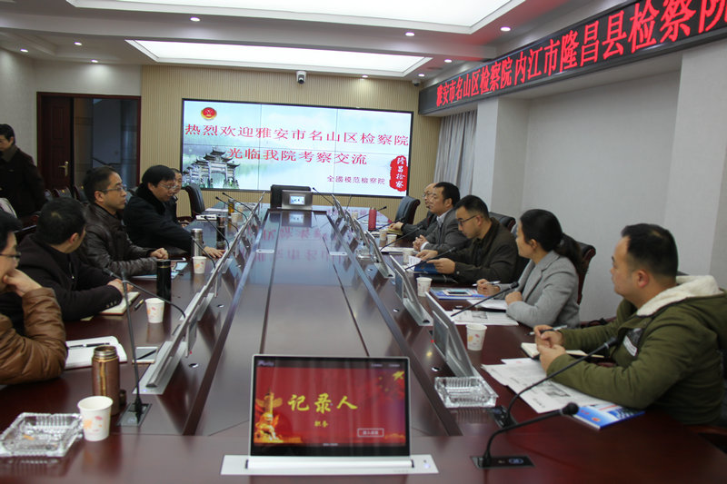 名山区院检察长李宣勇一行6人参观了仪陇县院的检察文化长廊、办案工作区、正在重新装修的检务服务大厅和隆昌县院的检察为民服务中心、青石文化墙、书吧、书画活动室、荣誉室、未检多功能办案区、数据中心,听取了仪陇县院反贪局综合科科长、侦监科科长、未检科科长、控申科科长、民行科科长采用PPT形式介绍的预防和查办职务犯罪、专项侦查活动监督、事实孤儿救助、未成年人犯罪酌定情节评价机制、刑事被害人救助五项特色亮点工作,观看了隆昌县形象宣传片、隆昌县院争创全国模范检察院的专题片。仪陇县院检察长唐蔚、隆昌县院检察长魏勇毫不保留地传授了“创模”工作经验并给予名山区院争创工作