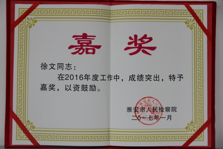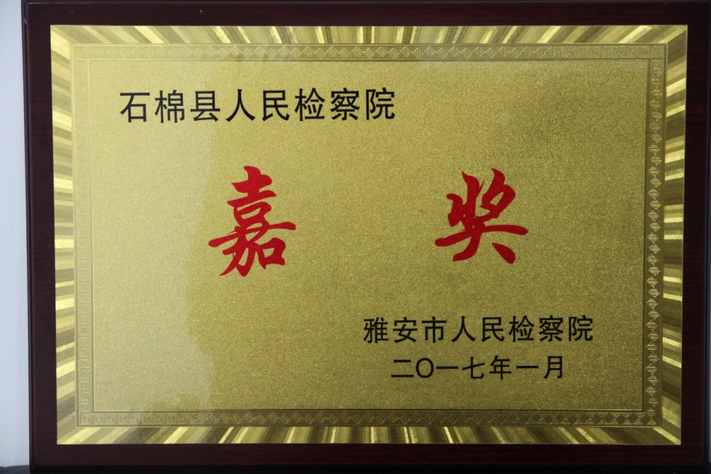 2017年1月25日,在雅安市人民检察院举行的全市检察机关总结表彰大会上,石棉县检察院荣获集体嘉奖,另有2名干警分别获得个人三等功和个人嘉奖。