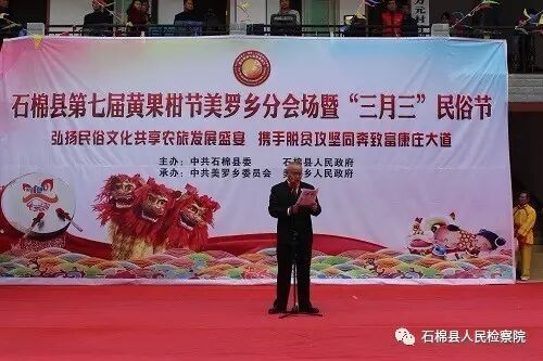 阳春三月,万物复苏,为弘扬民俗文化共享农旅发展盛宴,携手脱贫攻坚同奔致富康庄大道,3月29日,石棉县检察院部分干警参加了在本院精准扶贫联系乡美罗乡举办的“石棉县第七届黄果柑节美罗乡分会场暨‘三月三’民俗节”开幕式。开幕式在美罗乡客运站举行,县检察院党组书记、检察长吴超平同志代表石棉县委县政府致辞:对莅临美罗乡的各位领导、各位嘉宾表示热烈的欢迎,向长期以来关心、关注和支持美罗经济社会发展的各界朋友表示衷心感谢,真诚邀请大家实地考察该乡的生态风光、人文历史和投资环境,选择美罗、投资美罗,一同携手开创美好未来。