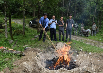 在销毁现场,县森林公安局、栗子坪自然保护区工作人员在检察院、法院、纪委工作人员的监督下,将猴骨和熊掌逐一清点后放入焚烧坑内进行焚烧,焚烧完毕后进行掩埋。石棉县人民检察院工作人员对销毁过程进行全程监督,确保野生动物制品被一一销毁。