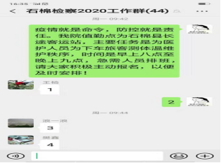 工作中的隐身人。第三党支部有党员干警8人、入党积极分子2人,疫情发生以来,支部全体人员毅然加入综合工作组、后勤保障组、宣传舆情组,成为战“疫”线上的隐身人。起草文件、统计干警旅居情况、测量进出人员体温、发放应急物资、及时推广疫情防控知识、宣传战“疫”的感人事迹、每天登记干警体温测量情况,复工后每天对办公场所、执勤卡点进行卫生消杀。一件件、一桩桩“小事”,在党员的眼中都是“大事”,疫情线上必须全力以赴,决不允许松懈麻痹。1月26日,第三党支部书记、办公室主任张燕第一时间返回岗位,起草了《石棉县人民检察院成立新型冠状病毒感染的肺炎疫情防控工作领导小组的通知》,编排了石棉县长途汽车站的值班值守和工作职责,统计了在职检察人员及家属的行程及身体健康情况,通过微信将石棉县检察院党组的工作部署迅速传达到每名检察人员;1月27日,20名检察人员参与到疫情防控阻击战中。她说:“疫情当前我能做的事情很小,但我会尽全力做好,我想通过一些细小的工作把联防联控责任担起来,阻断疫情传播,为中国加油。”第三党支部有5名女党员,1月26至2月12日,已累计起草文件11份,撰写检察人员参与疫情防控信息18篇,转发疫情防控小知识75次,她们是战“疫”线上最美的巾帼力量。