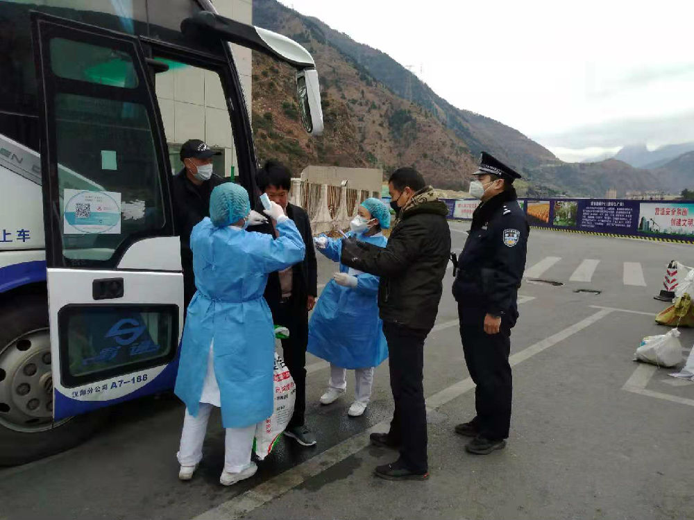 在石棉汽车站停车点,检察干警正迎来今晨第一辆客车。干警协助医务人员为乘客一一测量体温,并维护现场秩序。经检测,该次客车全部乘客均无体温异常和其他疑似新型冠状病毒感染的肺炎症状。