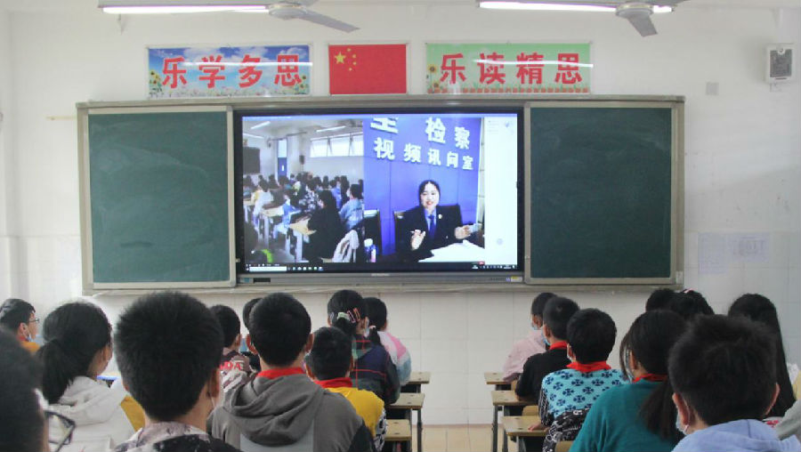 本次检察开放日与以往不同,结合当前疫情防控形势,为了最大限度保障未成年人的健康,天全县检察院借助第三方软件的视频传输功能与班级内的多媒体教学设备,成功实现了“云课堂”传检讯,实践了以网络搭桥为基础的“走出去”。